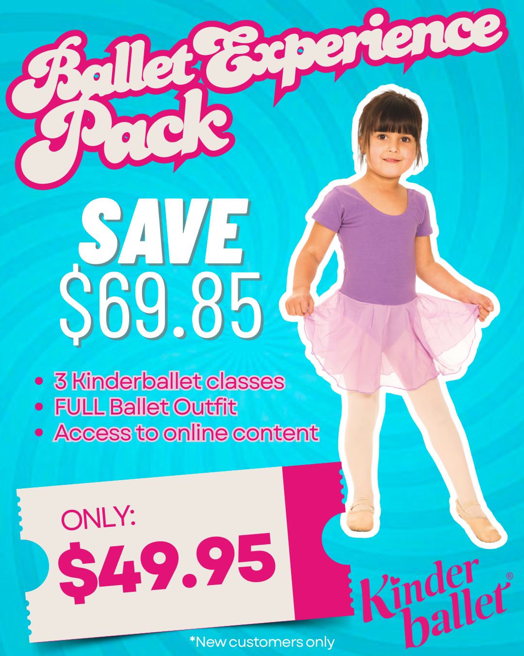 This offer includes: THREE Kinderballet classes, a FULL Ballet Outfit and access to several online exercises to get you going.
